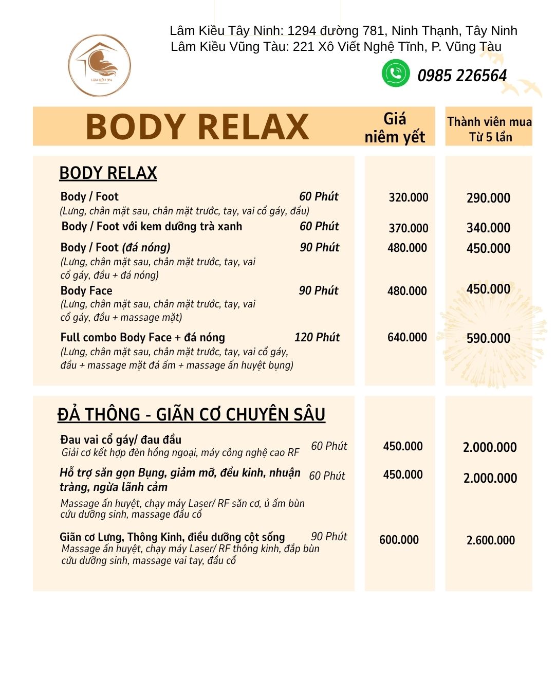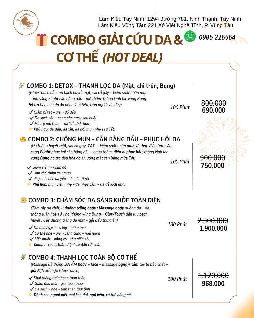 | Liệu trình giảm rạn da / Stretch Mark Reduction Treatment | 4.000.000 VND | Gói 05 lần: 16.000.000 vnd (tiết kiệm 4.000.000 vnd) / 5 sessions: 16,000,000 VND (Save 4,000,000 VND) | Rạn da sau sinh hoặc do tăng cân đột ngột, sử dụng công nghệ laser và vi kim để làm mờ vết rạn, khôi phục độ đàn hồi của da. / Stretch mark treatment for post-pregnancy or sudden weight gain, using laser and microneedling to fade marks and restore skin elasticity. |